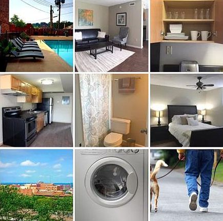 These renovated condos include hardwood laminate tile flooring, stainless steel appliances, dual washer/dryer, 2-inch wood blinds, and city views out the den windows. Community amenities include off-street parking, private pool and barbecue area. Utilities -- the units are all electric. The charge for water/sewer/garbage is included in rent.