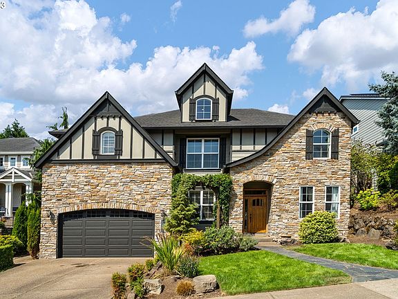 Spend some quality time in this beautiful Renaissance-built Tudor style home in West Linn. The front exterior features a bright front garden, stone facade, and covered entry leading to a gorgeous custom wood front door. Once inside you'll find a large dining room with tray ceiling to the left and a roomy office with french doors to the right. To the back of the home is a great room with kitchen, breakfast area with built in wine rack/storage, and living room with gas fireplace. The kitchen includes slab granite countertops, an island with gas cooktop, pantry, and much more. Sliding glass doors open to the private patio where you'll find charming stone stairs that lead you to the terraced and landscaped garden. Upstairs are 4 bedrooms plus a generous bonus/family room. The large primary suite is situated at the back of the home and features a tray ceiling and built-in shelving. The primary bath is perfectly designed with double sinks, soaking tub, tile shower, walk-in closet, and separate water closet. The other 3 bedrooms, bonus/family room, and laundry room are also located upstairs. Don't miss out on the tandem 3 car garage, central vacuum, sprinkler system, and side yard shed! This home is well cared for with brand new carpet throughout.
