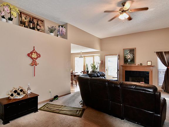 Open floor plan, great room with gas log fireplace with mantle, plant ledge, ceiling fan, kitchen with dining area and bay window, smooth top electric range, pantry, overhead lighting, owner suite ceiling fan, walk in closet with shelving, owner full bath, two level deck and patio.