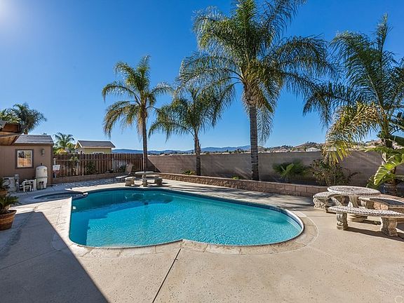 Welcome to your GORGEOUS Menifee pool home. Single story with 1779 Sq. ft 3 beds and 2 baths with an office that can be a 4th bedroom if you added a closet. An added room off kitchen lets the natural light in, gives you a beautiful view of the foothills, and makes a larger living space with an open concept off the kitchen.Spacious kitchen has granite counters, back splash, recessed lighting and ample cupboard space. The nearby family room has a cozy fireplace and a view of the backyard. When you enter in the door you will see a formal dining room and both bathrooms have been upgraded. The owners have taken excellent care of this home.French doors in master bedroom open to the beautiful back yard. Entertainers delight, sit and enjoy the pool underneath a custom made wood patio. Landscaped yard and fruit trees in back. Outside stucco has been updated with a Santa Barbara finish. RV parking, park a motor home and trailer on the drive way or behind the gate on side of the house. Wood shed for extra storage. Enjoy the unobstructed view of the foothills from your back yard. Awesome Neighborhood with quite neighbors who show a Pride of Ownership.The new community of Audie Murphy Ranch sits behind this neighborhood, you have access to Spirit Park and the hiking trails and sport courts with out the high taxes and HOA.Easy Access to 215 FWY and close to shopping and Restaurants at Menifee Market Place and upcoming Town Center Market Place. Amazing location and a MUST SEE HOME!