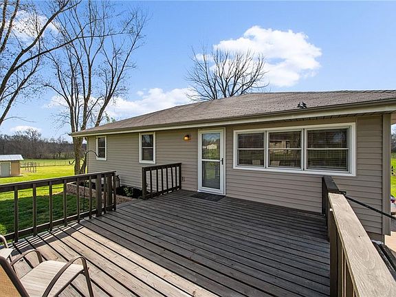 Serene 4 acre property conveniently located off black top highway, at the end of a gravel drive, featuring 3 main level bedrooms, 2 bathrooms, a two stall barn with tack room and garage. This property is every homesteaders dream with the lay of the land you have pasture, 3 exterior water access spigots, a chicken coop with brooding station, three out buildings (all have electrical service), Two mature pear trees, beautiful views, and a huge tilled garden bed. Updates and upgrades in all areas of this property starting with the luxury vinyl plank flooring, the stone tile fireplace, to the amazing updated basement. The main level has a front deck at entry and access to the double stairway back deck through the kitchen. The primary bedroom has access to the main hall bathroom and the back deck. The kitchen has dark wood cabinets, fitted perfectly for all the stainless steel appliances (they are staying!). You can access the basement through the kitchen, through the double doored walkout patio area, or back of house. The lower level could serve as a rec room/theater room, even a second primary bedroom. The full bathroom update is smart with blue tooth built in speakers, LED lighting, two closets, corian counter vanity, heated towel bar, and a huge walk in craftsman tiled shower. The major items have been taken care of with 1 year old HVAC, a new tankless water heater, water purifier & softner!