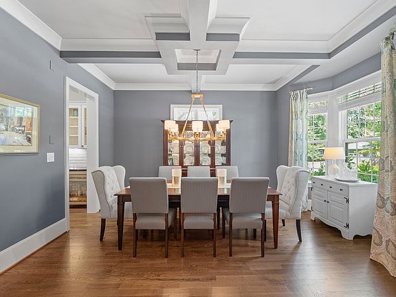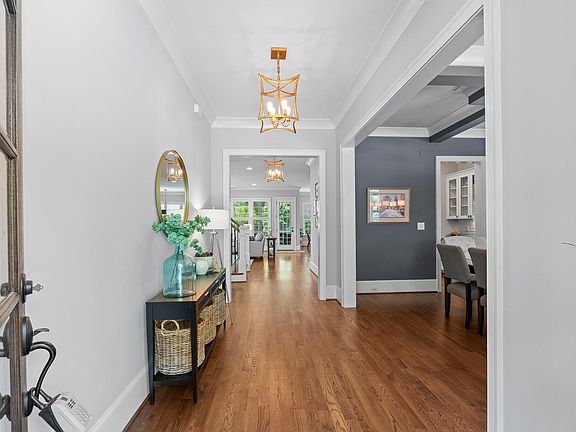 Beautifully landscaped and meticulously maintained, this custom-built home sits on a level lot with a charming rocking chair front porch. Inside, a light-filled foyer leads to a formal dining room with a coffered ceiling and bay window. A scullery with wine fridge connects to a bright, open kitchen featuring a large island, pendant lighting, Electrolux Icon gas cooktop with vent hood, farmhouse sink, wall oven, and microwave. The kitchen flows into a sunny breakfast room and spacious family room—ideal for everyday living and entertaining. The main floor includes a bedroom with ensuite bath, a separate study, and a practical drop zone off the two-car garage. A screened porch with ceiling fan overlooks the manicured backyard, perfect for outdoor relaxation. Upstairs, the primary suite offers a tray ceiling and spa-like bath with soaking tub, separate shower, double vanity, and water closet. Two additional bedrooms with ensuite baths, a laundry room with sink, and a bonus room with window seat complete the second floor. The 2022 finished third floor includes a bar area and versatile space for an office, media room, or playroom. Additional features include LeafFilter gutter protection, front, side, and backyard irrigation, and abundant storage. Conveniently located near Wildwood Country Club, Seven Oaks Swim & Tennis Club, Trader Joes, Brennan Station, I-540, and Creedmoor Road, this home combines timeless design with everyday functionality.