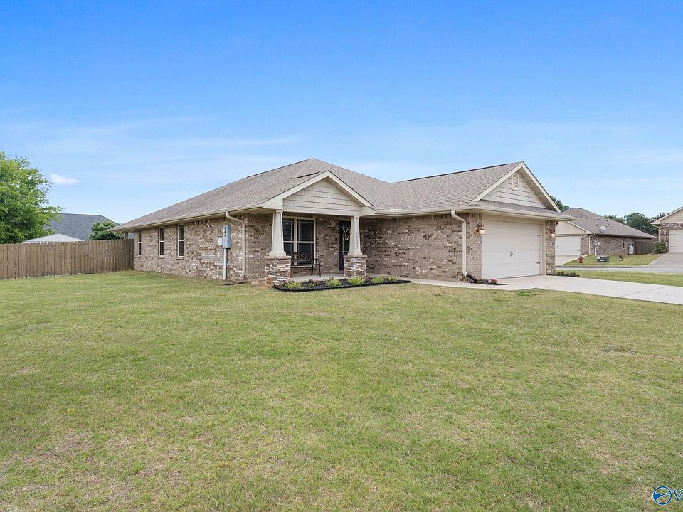 A covered front porch welcomes you to this inviting home offering fresh neutral paint throughout and a spacious open floor plan with 4 bedrooms, all with a walk-in closet, plus a study/flex room. Other features include hardwood floors in the main living areas, a large pantry and island in the kitchen, trey ceilings, and an isolated master suite. Outdoors enjoy the oversized corner lot with a privacy fenced backyard and a covered back patio with a ceiling fan - plenty of room for recreation and relaxation. Conveniently located just a short drive away from Redstone Arsenal, Research Park, I-565 and many popular dining, shopping and entertainment options.