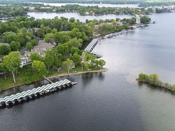Rare townhouse in Pelican Point with 32' covered dock slip on Lake Minnetonka! Main-level living and open concept with hardwood floors, enameled woodwork and large center-island kitchen. Sun-filled living room with stacked stone fireplace and access to wrap-around deck. Large primary suite with luxury bath. Walk-out lower level features amusement room with fireplace and wet bar. Step out to the screened porch and lush gardens. Park-like lakeside grounds with multiple gathering areas. Private storage locker for boat supplies. Quiet neighborhood setting close to all conveniences. Move in and enjoy the lake this summer!