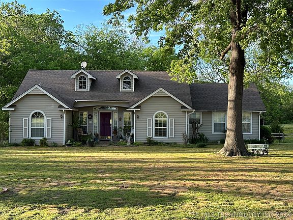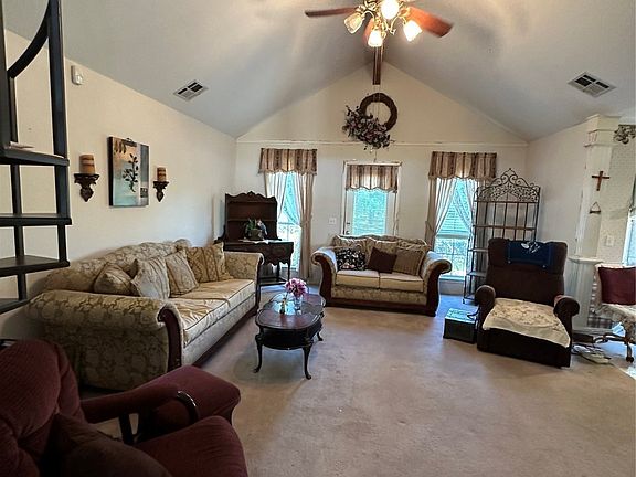 This cute COUNTRY STYLE home is located on a beautiful square 5 acre tract with lots of trees, flowers, pond and a creek with a bridge. Has an outdoor covered gazebo/patio area, swing set, small storage or playhouse. Plenty of room for your family to enjoy this 5 acres. Home has a nice entryway leading to a large living room with vaulted ceiling and is Open to Kitchen with Center Island and Breakfast nook. Formal Dining Room that could be used as an office, etc. Master Bedroom has a large walk-in closet and private bath with a Shower. Extra Bedrooms have a regular size closet, with a Hall Bath located between them with a bathtub/shower. The spiral staircase in the living room leads upstairs to the Hobby Room/Small Den and it could easily be used as a 4th Bedroom. DEED RESTRICTIONS: No personal or commercial growing or selling of marijuana.