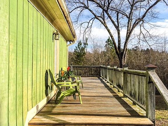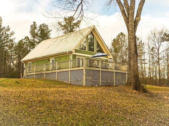 A HIDDEN SURPRISE... NOT YOUR TYPICAL A-FRAME! You will feel like you're in a private mountain setting but have the in-town location close to shopping, schools, & Lake Sinclair. This 2 bed/2 bath home is loaded with charm & warmth. Heartpine vaulted ceilings, gorgeous hardwood floors, cedar beams, open living area w/ a kitchen that has tons of cabinet space. A cheerful master suite w/walk-in closet & master bath featuring a jetted tub, modern fixtures, & skylights. The 2nd fully enclosed bedroom is upstairs & has its own full bath & large closet. Outside on the large wraparound deck is where you will want to spend your time, overlooking a huge, open backyard surrounded by the privacy of woods & trails. Separate storage building for outdoor equipment or could be the perfect man cave!