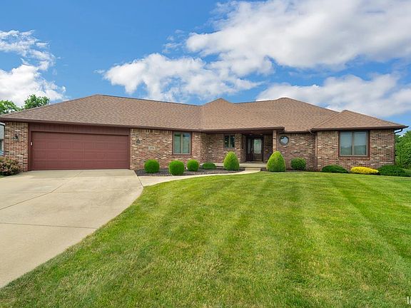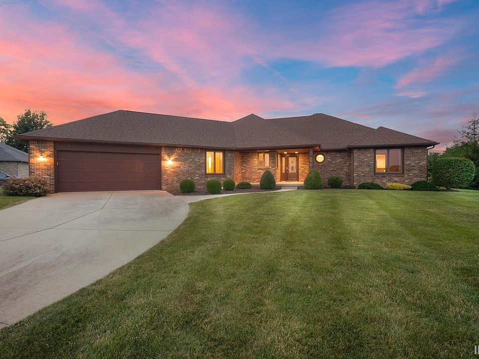 Welcome to this stunning custom-built all-brick ranch nestled on a generous 0.44-acre corner lot in the highly sought-after Waters Edge subdivision. Designed with comfort, convenience, and timeless elegance in mind, this meticulously maintained home offers the perfect blend of open-concept living and thoughtful craftsmanship. Step inside and be greeted by soaring vaulted ceilings and a spacious, light-filled living area that flows effortlessly into a chef’s dream kitchen. The kitchen is a true centerpiece, featuring an abundance of custom cabinetry, an oversized island with elegant pendant lighting, under-cabinet illumination, and room to gather, cook, and entertain in style. With two spacious bedrooms plus a large den that easily serves as a third bedroom or home office, this floor plan adapts to your needs. The primary suite is a private retreat, complete with a walk-in shower and an en-suite bath, while the guest bathroom boasts a large vanity and a convenient tub/shower combo. Both bedrooms include custom-designed closets, offering ample storage with a luxury touch. Enjoy your morning coffee or evening relaxation in the oversized sunroom, which opens to a beautifully hardscaped concrete patio complete with a brick sitting wall. Mature trees line the back of the property, creating a peaceful and private setting rarely found in subdivision living. Additional highlights include a newly installed instant hot water system, a large attic with wide stairwell access from the garage for easy storage, and the low-maintenance lifestyle that comes with Waters Edge living, where the HOA covers your lawn care and landscaping. Located minutes from the South Branch Library, grocery stores, restaurants, and shopping, this home also offers unbeatable access to both US-31 and IN-931, making commuting or weekend getaways effortless. If you’re seeking a quality-built home that blends privacy, convenience, and luxury in a premier neighborhood, this is the one you’ve been waiting for.