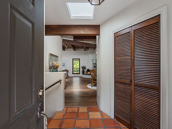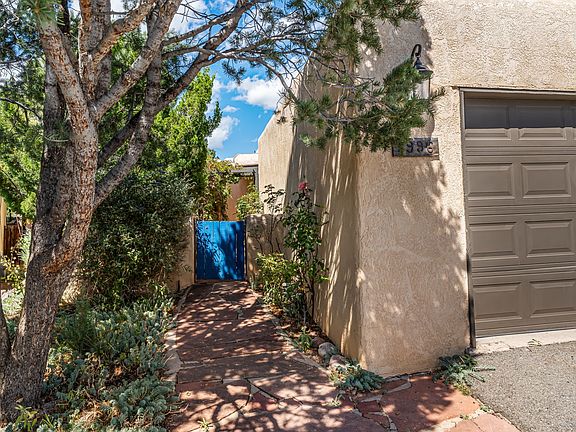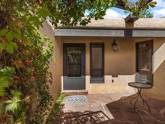 Welcome to this beautiful, single-level home in the quiet interior of Park Plazas, one of Santa Fe’s most desirable neighborhoods. The spacious living and dining room is filled with natural light from clerestory windows with diffusers, and features a wood-burning corner Kiva fireplace with stone banco as well as sliding doors that open to a lovely flagstone patio and lush outdoor retreat. The kitchen offers matching, all stainless appliances, colorful Mexican tile counters, and a generous breakfast nook with a large skylight that connects conveniently to the two-car garage. The primary suite includes sliding doors to a private enclosed patio, a spacious walk-in closet, and an ensuite ¾ bath, while the second bedroom has two closets and the guest bath features a Talavera sink and skylight. Outdoors, the property delights with fruit trees—including apricot, plum, nectarine, and cooking cherries—along with grapevines, roses, and abundant plantings, all on a timed drip irrigation system. Stately evergreens line the west side of the yard in a graceful semi-circle, creating both beauty and privacy. With newer flooring throughout, fresh paint, forced-air heating, and refrigerated air conditioning, this home is move-in ready. Park Plazas residents enjoy miles of walking trails, a community garden, playground, basketball and tennis courts, and an off-leash dog park—all just minutes from Santa Fe’s shopping, dining, and cultural attractions.