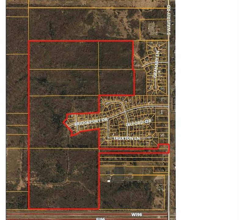 Approximately 110 acres west of Waverly set for residential development. Parcels are zoned R-1B and R-1D. Approximately 72 acres Lansing schools, 38 acres Holt schools. Waverly road frontage is in Holt schools. Additional access at Bridgeport. Previous preliminary renderings available showing 243 proposed sites. Property is currently majority wooded.