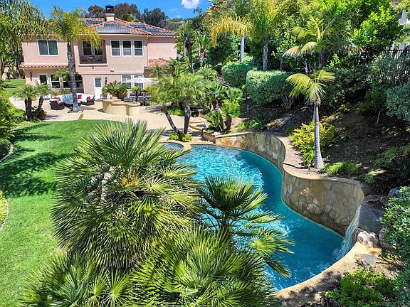 Exceptional opportunity to own this exquisite property in the prestigious Rancho Carrillo community. Where refined living meets undeniable elegance, this beautiful home rests on an oversized lot featuring resort style lush gardens, a gorgeous free form pool, spa and an exceptional waterfall for the center piece of the backyard. Upon entry, elevated proudly above the street, you'll be welcomed by soaring ceilings and abundant natural light. The home features a formal dining and living room, an open kitchen floor plan with a walk-in pantry, wine refrigerator, granite counter tops, and a breakfast nook; leading to a spacious family room featuring a beautiful fireplace, built-in cabinet and view. A bedroom suite with a full bath offers a separate entrance to the backyard, which makes accommodating guests convenient. The primary bedroom has a spacious layout, fireplace, duel large walk-in closets, balcony with a view, and duel grand bathrooms. With its unbeatable location, this home is undoubtedly a very special offering. There are many hiking trails nearby, community pool, Leo Carrillo Ranch, and an abundance of shopping and entertainment close by. Don't miss your opportunity to make this dream home yours!