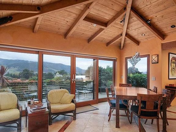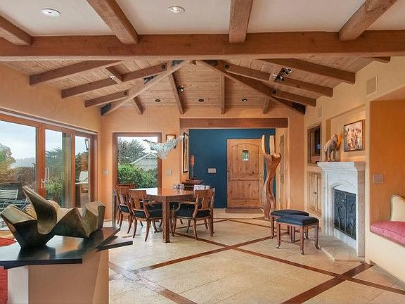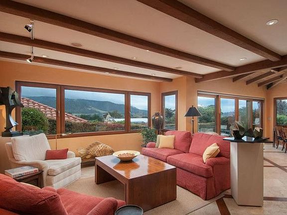 Mediterranean villa w/views of ocean, Pt Lobos & Carmel Mission. Open Great Room w/travertine/walnut floors, large fireplace & German doors leading to a balcony w/fire pit. Kitchen has views, travertine counters, alder cabinets & top appliances. 2 ensuite bedrooms on main level. Upstairs devoted to master w/fireplace, huge closet, den, large bath & balconies. Separate guest house included in SF.