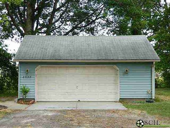 Fixer upper! The home has a welcoming covered front porch, 2 bedrooms and 2 baths. Large living room w/knotty pine walls, wood beam ceiling and brick fireplace w/wood stove insert. Master bedroom w/full bath and plenty of closets. Applianced kitchen, and washer & dryer remain. Vinyl replacement windows, lots of storage, oversized 2 car detached garage w/keyless entry, fenced back yard, mature trees and creek on property. Sold "as-is". Great country setting in town on over 1 acre.
