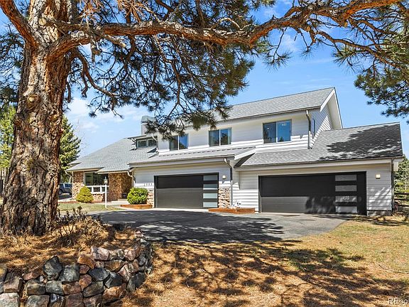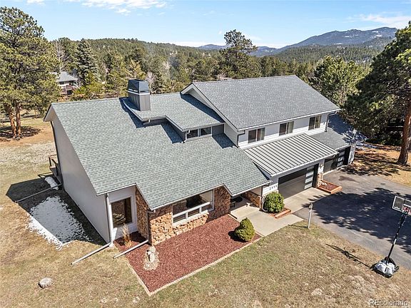 Welcome to this beautifully updated contemporary home in the sought-after Hiwan neighborhood. With 6 bedrooms, 4 bathrooms, and over 3,300 square feet of thoughtfully designed living space, this home offers comfort, style, and plenty of room to grow. Situated on a nearly one-acre, mostly fenced and level lot, there's endless space to roam, play, and entertain. Inside, the main level features newly refinished hickory floors, a spacious kitchen and dining area, and a guest suite thoughtfully positioned for privacy - ideal for visitors or multi-generational living. The kitchen is a chef's dream, boasting granite countertops, custom cabinetry, and stainless steel appliances. The main floor office is set up for remote work. Step outside through sliding glass doors onto the brand new Timber Tech deck, perfect for summer BBQs, backyard games, and enjoying the Colorado sunshine. A rare find, the oversized 4-car garage and flat, paved driveway offer ample room for cars, toys, and gear. The home has the perfect Colorado orientation, west facing driveway for melting snow, east facing deck for afternoon comfort. Located in the top-rated Evergreen school district and zoned for Bergen Meadow/Valley, Evergreen Middle, and Evergreen High School, this home combines convenience with quality education. You're just minutes from Elk Meadow Open Space Park, charming downtown Evergreen, and I-70 for quick access to Denver or a mountain getaway. This home has it all - space, style, & location. Don't miss your chance to see it in person! Additional highlights: the lower level offers a cozy family room with a wood-burning fireplace - perfect for gathering on snowy evenings; energy-efficient newer, Pella windows throughout maximize natural light while keeping utility costs down; the primary suite features an en-suite bathroom with updated vanity, separate tub, and shower. Enjoy mountain living with all modern conveniences, including high-speed internet and smart home capabilities.