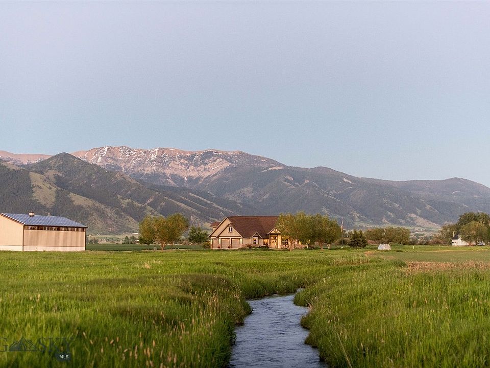 Are you looking for protected views and immense privacy? This property is situated on 2.4 acres and is surrounded by a 313+ acre conservation easement. As you approach Penwell Bridge Road, you're greeted by a stunning 4,000+ sq ft custom home and detached shop. Once inside you will find vaulted ceilings and an open-concept layout that seamlessly integrates a formal dining area, an eat-in kitchen, an office/guest bedroom, and an incredible kitchen layout. The kitchen is equipped with all major appliances including but not limited to; dual wall ovens, a warming drawer, a range hood, and tons of cabinetry accented by quartz counters making it the heart of the home. Enjoy summer days on the expansive back patio, designed with stamped concrete and offering unrivaled views of the Bridger Mountain range. The patio is stubbed for gas, perfect for grilling to your heart's content. Retreat to the master suite, featuring an oversized walk-in closet with custom built-ins, luxurious tile work, a soaker tub, a floor-to-ceiling tile shower, and in-floor heating in the master bath. This suite also connects to a versatile secondary room that can serve as an office or nursery. Two additional bedrooms on the main level share a Jack and Jill bathroom, also with in-floor heating. Upstairs, a massive bonus room provides endless entertainment possibilities, complete with space for a pool table. The three-stall garage offers ample space for vehicles and equipment. Need more space? A detached shop equipped with solar panels powers the primary residence, reducing energy bills. The estate can also be purchased with the neighboring 300+ acre functional farm protected by the conservation easement allowing for income opportunities while preserving privacy and views. The picturesque South Fork Ross Creek meanders through the property, perfect for summer fun. (Parking stalls includes house garage and shop). See MLS #392632, #392938