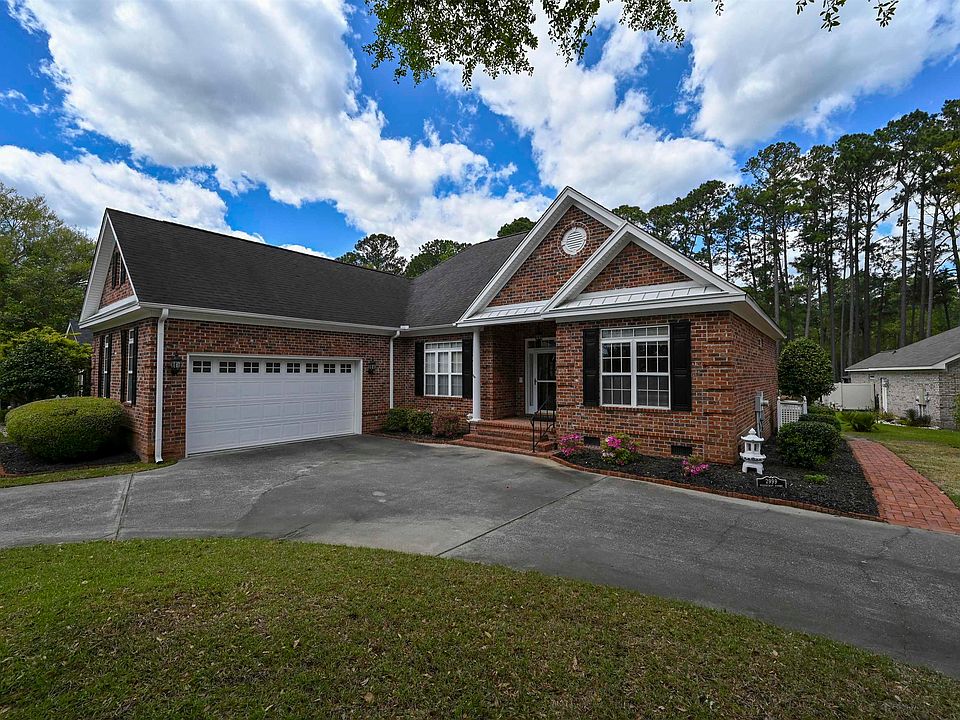 Nestled within the scenic landscape of the River Hills Golf and Country Club community in Little River, SC, stands this graceful, all-brick home radiating elegance. Boasting 3 spacious bedrooms and 2 full bathrooms, it caters to those with a taste for refined living. Set on a charming corner lot adjacent to a tranquil cul-de-sac, this residence welcomes you with a circular driveway, adding to its curb appeal. Inside, natural light floods the single-level layout, accentuating its high ceilings, crown molding, and hardwood floors throughout. Storage is abundant, with ample closet space in the bedrooms and a convenient linen closet in the guest bathroom. The living and dining areas offer generous proportions, while the kitchen impresses with a breakfast nook, stainless steel appliances, and a pantry. A laundry room, accompanied by an adjoining walk-in pantry, adds to the home's practicality. The master bedroom boasts a grand tray ceiling and a sizable walk-in closet, while the master bathroom beckons with a garden-style jacuzzi tub, separate shower, and abundant natural light. Outside, a spacious covered patio with a ceiling fan invites you to unwind and savor views of the golf course. Enhancing comfort and efficiency, this home features a brand-new tankless water heater and A/C system. Experience the quintessence of coastal living in this captivating River Hills abode, where every detail has been meticulously curated to elevate your lifestyle and forge enduring memories.