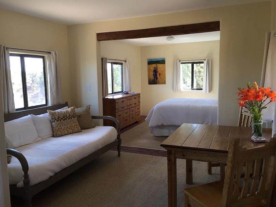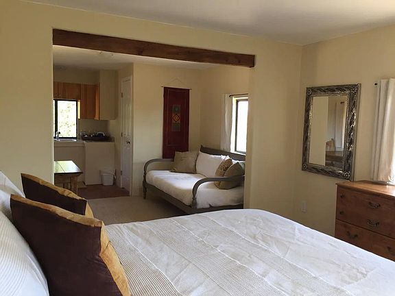 Your private oasis off the Turquoise Trail. Only 10 minutes from the artsy town of Madrid (famous for its Christmas lights!) and an easy, beautiful drive into Santa Fe. Private entrance, spacious bedroom, separate living area with daybed, bathroom, kitchenette with mini-fridge and microwave, deck and amazing views of the desert and mountains! Tenant pays $50/mo. for weekly trash service, electric and shared WiFi (20MB DSL). No cable/dish available. No smoking in the guest house. Maximum two tenants. One parking space. Tenant is responsible for snow removal on paths around the casita. Lease term: Minimum six months.
