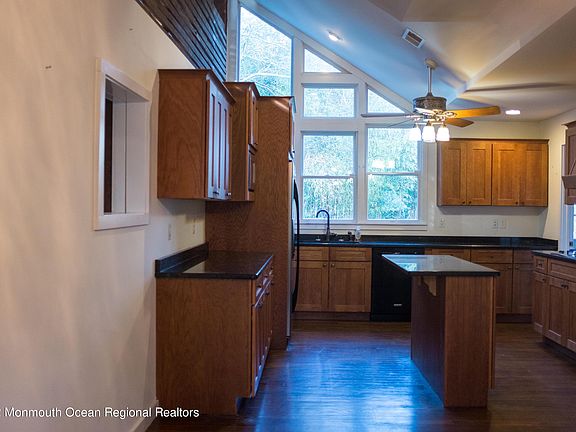 Move into this 4 bedroom ranch having a remodeled gorgeous kitchen with a granite center island, stainless appliances, abundance of cabinets and laundry room right off kitchen. There is a formal dining room, sunken living room plus an entertaining loft area with slider to a balcony, a half bath and walk in closet open to kitchen area below. The master has a woodburning fireplace, hardwood floors, vaulted ceiling, walk in closet and a bath with Jacuzzi whirlpool tub, separate stall shower and double sinks. There is hardwood in the hallways, the living room and dining room. The bedrooms all have carpeting and ceiling fans. There is another full bath in hall. There is an office with 1/2 bath on opposite side of living room by starirway up. PLEASE NO PETS or SMOKING. NONE of the outer buildings are for the tenants use. All this plus the excellent location to NYC transportation, Routes 79, 18 and 9 and shopping.