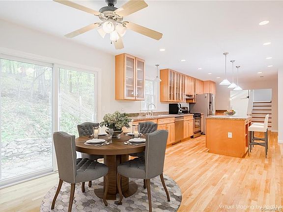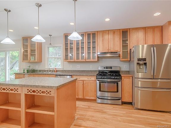 Fall in love with country living at its best, complete with red barn, private pond, fire pit and wrap-around front porch ready for you to place your Adirondack chairs and enjoy starlit nights. This lovely move-in-ready home features main level master bedroom with walk-in-closets, newly renovated master bath with marble counter double sink vanity, tile floor and oversize shower with frameless glass doors. Hardwood floors throughout, spacious eat-in-kitchen with new sliders to the rear deck, center island, propane cooking and dining area with new sliders to deck. Family room with fireplace and sliders to patio, rec room with skylights, laundry, half bath and formal dining room with fireplace complete the main level. Upper level is host to three bedrooms, one is en-suite with walk-in-closet and two additional with full bath in the hallway. The lower level has hardwood floors, perfect for den, office space and ideal for additional overnight guests. This property is a corner lot, accessible from Pine Hill - The red barn is perfect for storage or even a man cave or she shed! There's a level area with play gym as well as a pond with fire pit to enjoy roasting marshmallows. New roof and fresh paint 2020, new front doors and sliders - 2020, newer oil burner and well pump, there's nothing to do but move-in! Close to hiking trails, Candlewood Lake, Squantz Pond, in-town shopping, schools, and easy to major highways. Only 60 miles to NYC Welcome Home, You're Going to Love it Here! Ideal professional in-home office space with separate entrance from driveway into two finished lower level rooms.