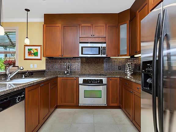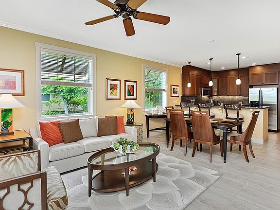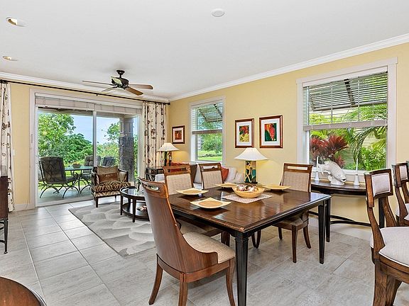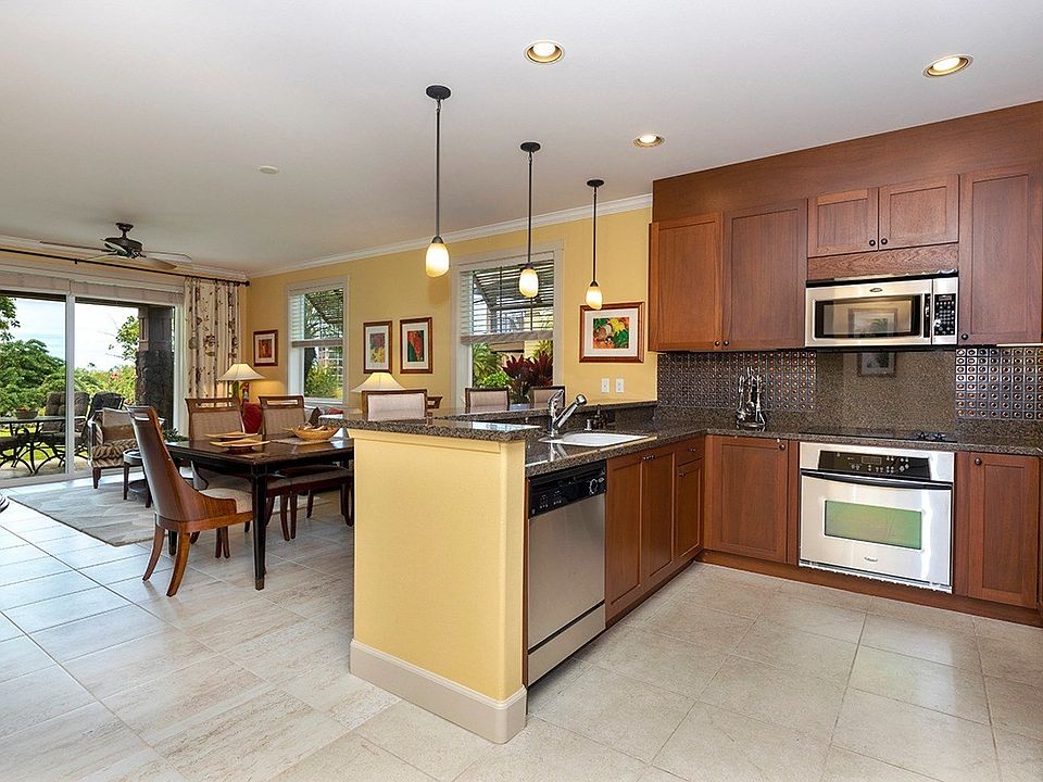 Halii Kai 2H is a three bedroom ground floor end unit on the golf course. This floor plan is a favorite of owners and guests with sliders leading out to the lanai where you can enjoy the private location with a large grassy "lawn" in front of the Waikoloa Beach Resort golf course. This immaculate condo has never been rented but is eligible for a short term vacation rental license. It will be sold turnkey furnished, ready for rentals or for your own occupancy. Halii Kai condos feature quality steel frame construction and upscale finishes throughout including granite countertops, stainless steel appliances and African Mahogany cabinets and doors. The owners of this unit added crown and window moulding, a backsplash in the kitchen and replaced original carpet with tile in the great room. The condo comes with a garage to store your car and beach toys, and a second deeded parking space for guests. Walk, drive, or bike to the oceanfront private club with free form salt water pool, fitness center, and the full service Ocean Club Bar & Grill to view fabulous sunsets, whales in season, and dolphins year round. There is a tennis court and half basketball court at Halii Kai as well. Waikoloa Beach Resort boasts two golf courses, two shopping centers, two hotels and plenty of wonderful restaurants. There is even a luxury cinema, and a gourmet supermarket at the Queen's Marketplace. Spend a beach day on the white sands of Anaehoomalu Bay while watching the paddlers and kite surfers, and end the day enjoying the live Hawaiian music and waterfront dining at Lava Lava Beach Club.