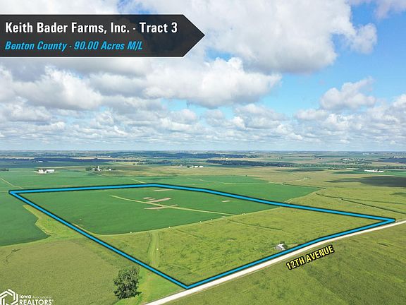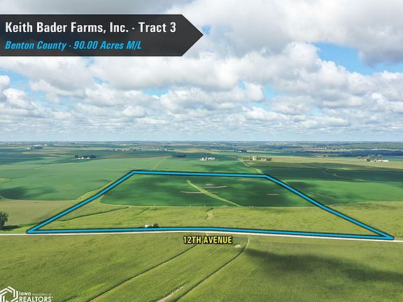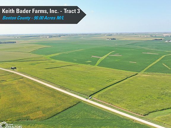 Tract 3 consists of 90 acres m/l with an estimated 89.61 FSA cropland acres, of which 4.33 acres are certified as grass. The tillable acres boast an average CSR2 soil rating of 88.7, well above the Benton County average CSR2 soil rating of 79. The primary soil types include Dinsdale silty clay loam, Kenyon loam, and Colo-Ely complex with the cropland acres classified as HEL (Highly Erodible Land). The balance of the tract consists of a 0.17 acre m/l building site that includes a wooden barn built in 1950. It is being sold in "as is-where is" condition. Tract 3 is located 6.5 miles northeast of Dysart, Iowa along 12th Avenue in Section 29 of Bruce Township, Benton County, Iowa.