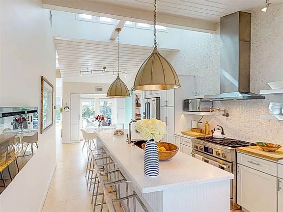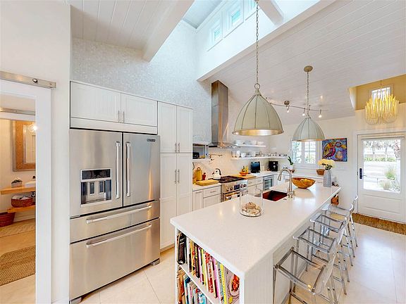 This timeless, ocean view oasis is imbued with style, spirit and sophistication that is rarely seen in St. Augustine. Ideal for the discerning buyer who loves both barefoot elegance and outdoor living, the mindful renovation brought it far beyond its days as a beach bungalow. Located just off the sugar-white sand of St. Augustine Beach, this home is characterized by its soaring cypress ceilings, stunning design, and clean architecture which captures glowing natural sunlight. Upon entering this private retreat, the beachgoers fade into the distance. Intelligently configured for optimal privacy and use of space along with breathtaking design. Beautiful limestone floors adorn the downstairs, and the electric Dimplex fireplace in the kitchen and gas fireplace in the living room keep the ambiance warm. Gourmet kitchen features include top-of-the-line Jenn Air appliances and gorgeous solid-surface modern countertops, complimented by a natural Mother of Pearl backsplash. This home transcends the standard with every remarkable detail -modern glass sliding barn door to full pool bath, custom accents including built-in shelving, fully tiled accent wall and cable wire stair rails. Each of the three bedrooms offer carefully selected Big Ass fans, chic lighting and custom built-in closets. The downstairs master bedroom offers en suite, spa-style bathroom and his & hers walk-in closets. The upstairs master bedroom is a luxury loft with sitting area, cedar-lined closets, and a large, ocean view patio with exterior stairs to the backyard. Elevated style carries through to the backyard oasis with heated pool with waterfall and bamboo privacy screen, lush tropical landscaping, summer kitchen with leathered granite counters and AOG grill, ample storage, and detached, air conditioned office/pool cabana. Even the pooch has a place here in the sprawling courtyard with an outdoor dog wash adjacent to the hot/cold outdoor shower. Check out the 3D Tour.