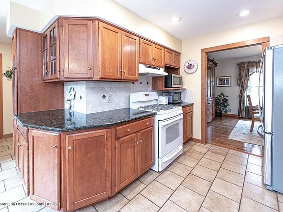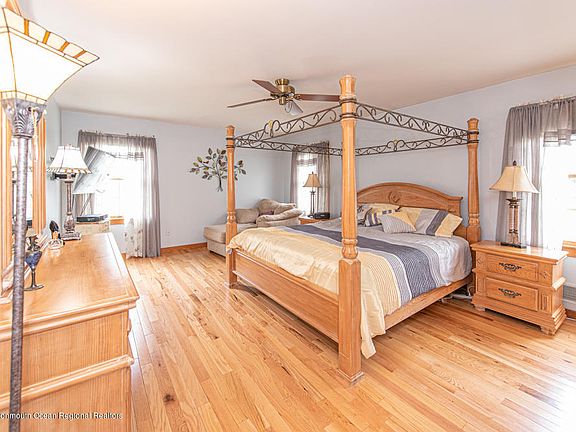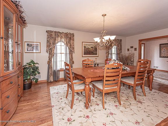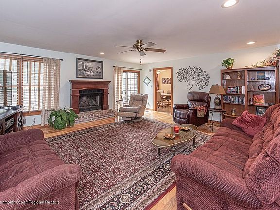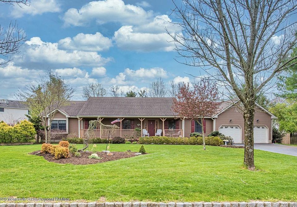 Lovely spacious country ranch in mint condition located in prestigious community in Farmingdale. This home has it all! 4 bedrooms include spacious master bedroom w/walk in closet, full bath with new walk in shower. 2.5 baths & laundry room all on one floor! Enter this home via covered 40 ft. long front porch to open foyer leading to spacious formal dining room & huge great room with gas fireplace. Spacious kitchen with newer granite counters, dishwasher & refrigerator. Dinette section fits large table overlooking the yard. Lovely newly renovated main bath. Hardwood floors throughout most of the home! Fall in love with private yard overflowing with flowering plants, lush lawn & flowing fountain, 2 room cabana/shed, deck with above ground pool! 4.5 foot crawl space and attic storage!