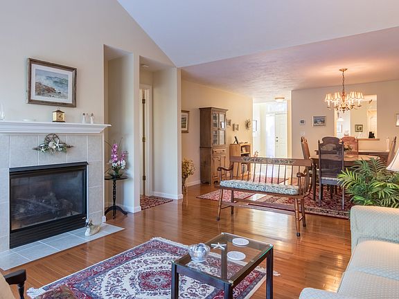 One floor living in this bright "R" floor plan in Winslowe's View in The Pinehills. White kitchen cabinets, Corian counters, white appliances and plenty of natural light. There is a large sitting area/family room off the kitchen being used as a breakfast area overlooking private patio/courtyard. The formal living area has hardwood flooring, gas fireplace, and sliders to private, large deck. The adjacent dining room with hardwood flooring adds to the open floor plan. Master suite with vaulted ceiling, two closets, including large walk-in closet, Corian countertops, large tiled shower stall and double sinks in the bathroom. Private 2nd bedroom suite with full bath on main level. Unfinished lower level with walkout. New Furnace, Hot Water Heater, refrigerator and washer and dryer all with warranties. Beautifully maintained home.