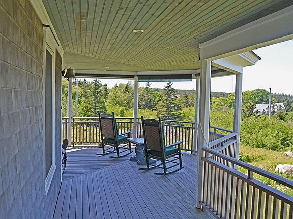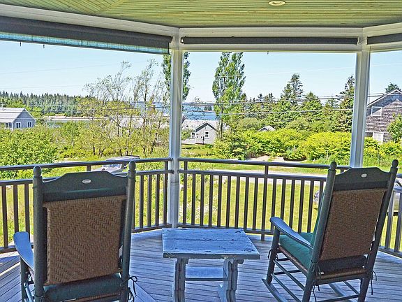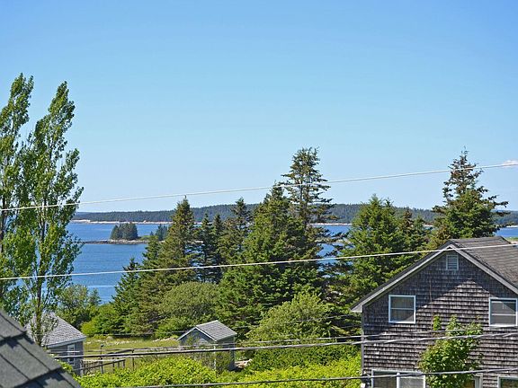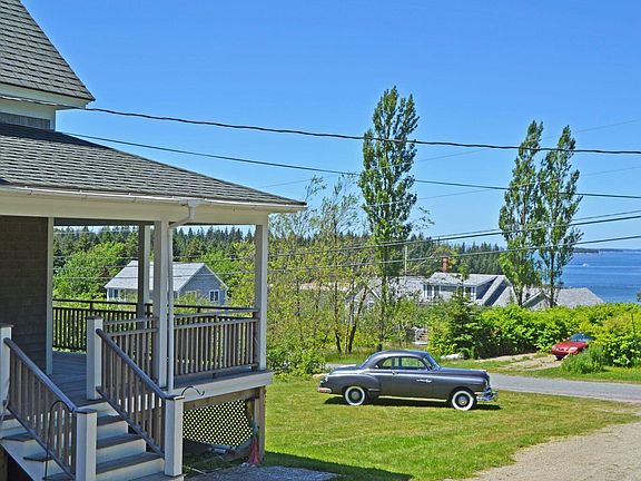 Enjoy cool ocean breezes, sunsets and views of the Isle au Haut Thorofare from this beautifully renovated, antique farmhouse located near the village center on the beloved island of Isle au Haut. Built in 1911, the classic island home is being offered fully furnished and turnkey. The light-filled home was fully renovated in 2005, boasting a wonderful wrap-around porch with water views, gleaming hardwood and tile flooring throughout. It offers three bedrooms and three full bathrooms with tiled showers and heated towel bars. The first floor includes a dining room, chef's kitchen with center island, an office, a large living room with wood-burning fireplace, laundry room with utility sink and a full bathroom. The second floor includes a large primary bedroom suite with two closets, an ensuite bathroom and wonderful ocean and island views. There are also two additional guest bedrooms with views and a shared guest bathroom. The property also includes a large garage with a studio guest apartment above, ideal for guests or potential rental income. Sunset Hill is located just moments away from the village grocery store, post office and town landing. Isle au Haut is accessible by private boat or passenger ferry which operates year-round from Stonington. About half of Isle au Haut is part of Acadia National Park, protecting the rugged beauty in perpetuity.