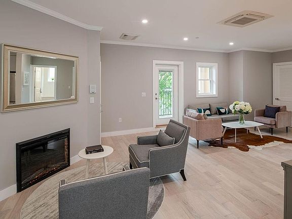 New contemporary ground up construction located in desirable Jeffries Point area of East Boston. This open concept home features two generously sized bedrooms, 2 full bathrooms with oversized closet space, private balcony off the living room and 1 deeded garage parking space. Modern finishes include brushed oak flooring, quartz countertops, with center island, professional grade Kitchen Aid appliances, marble backsplash, 42" cabinets, fireplace, LED lighting throughout, 6' windows and expansive 9' ceilings. The master bathroom boasts a quartz double vanity, walk-in glass (glass to be installed soon) shower and radiant heat flooring. Other features include, efficient, recessed mini-splits for heat & A/C and wifi access to building Enjoy the pet friendly backyard with common patio area for late night barbecues! The property is conveniently located steps from the East Boston Waterfront, Porzio Park, bike baths & much more!