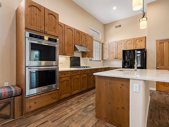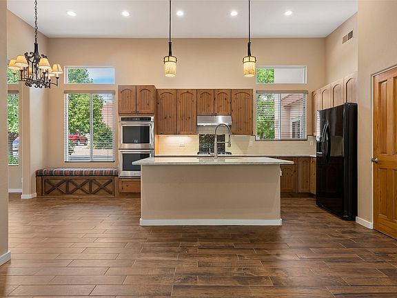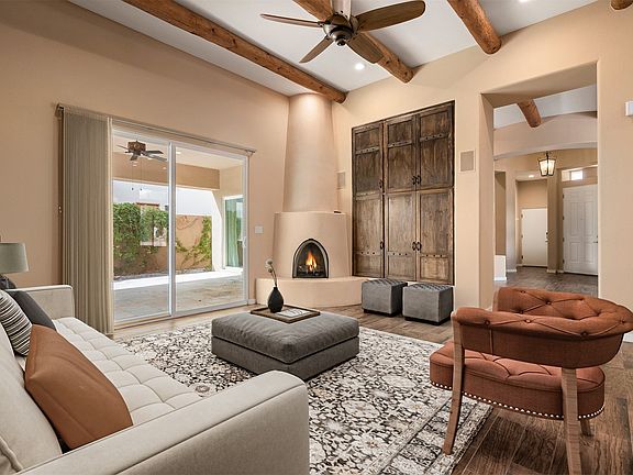Look here: a stylish and updated home on a desirable corner lot! This immaculate single-level home has been extensively updated and shows beautifully. With over $170,000 in thoughtful renovations completed just a few years ago, the home feels modern, fresh, and move-in ready. The kitchen is a true centerpiece, featuring granite countertops, a custom tile backsplash, double ovens, a five-burner gas cooktop, under-cabinet lighting, a remodeled island, and a charming window seat. Wood-look tile flooring, bedroom carpet, and a paint refresh complement the home’s warm modern-rustic style, while recessed LED lighting adds everyday brightness. The spacious primary suite is a serene retreat with a spa-like bath. You will love the separation from the other bedrooms. With four additional bedrooms—including a private ensuite with its own exterior access—the floor plan offers flexibility for guests, a studio, an in-home office, exercise room, media room and more! Outdoors, enjoy a covered portal with views of the Ortiz Mountains and thoughtfully designed landscaping that bursts with seasonal color from Virginia creepers, rose bushes, and ornamental fruit trees. All this in an unbeatable location: just 12 miles from the historic Santa Fe Plaza and only minutes to shopping and dining. The Rancho Viejo HOA enhances the neighborhood with multiple parks, vast open spaces, scenic paved trails, and well-kept surroundings protected by reasonable covenants. A home that blends style, comfort, and convenience — and one you’ll be proud to call your own.