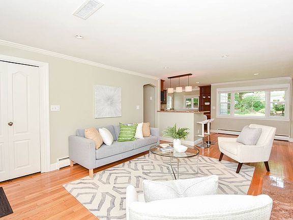 Welcome home! This expanded ranch sits on a beautifully-manicured oversized corner lot in one of Waltham's most desirable neighborhoods. Enjoy single-level living at its finest. You will love having central air, a primary bedroom suite with a California closet, renovated bathroom featuring a jacuzzi, convenient laundry, plus a walk-in shower! Direct entry into the garage, an inviting open floor plan, and solar panels set this modernized home apart. Fully-equipped kitchen with granite countertops and cherry cabinets. Enjoy summer evenings in your lush backyard oasis and winter nights nestled by the gas fireplace. The finished basement entertainment room features a bar that makes it perfect for hosting game nights and gatherings with friends. The basement also features a massive storage area with high ceilings and a bonus secondary laundry room with a cedar closet. You won't find another home like this one!