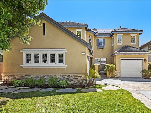 Fantastic opportunity to own this lovely 5 bedroom home located on a cul-de-sac within walking distance to shops, restaurants and farmer's market! Every inch of this home has usable space with the IDEAL floor plan. Upon entry, the formal dining room opens up to a large playroom (also could be used for an office, formal living room, exercise room, many options..) that closes off with custom farmhouse sliding doors. The light & bright living room has a fireplace and connects to a completely renovated white kitchen with island, high-end appliances, quartz countertops, designer backsplash, & ample storage space! The downstairs powder room has designer flooring and gorgeous brass fixtures. Upstairs, there are 4 large bedrooms. The primary offers pretty views of mountains and trees. Incredible ensuite bathroom with separate sinks, luxurious floating bathtub & fashionable lighting. The private, wrap-around backyard has no homes behind it, large enough for a pool and even has a casita! This 5th bedroom opens up to double French doors with an ensuite bathroom. Ideal for guests, family, office or work-out room. The home has been re-piped with PEX, reverse osmosis drinking water system, has paid off solar panels & includes an electric charging station. Welcome home!