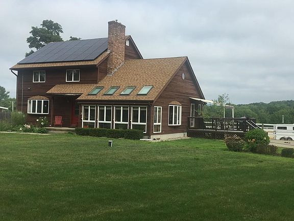HORSE LOVERS this is the home for you. Very attractive active working horse farm located in Granby just down the street from 5 Corners. Well designed Colonial with 2 story Living Room with interior balcony, spiral staircase, an abundance of windows and fireplace with pellet stove insert. Very large well designed kitchen with great center kitchen island. First floor Master Bedroom with full bath and jetted tub. Second floor with 3 good size bedrooms and a recreation room in the finished basement. Large deck with awning. 2 separate 2 car garages. 90 'x 120' lit sand ring for horse riding. 6 + stall horse barn , 3 large grass pastures, 2 large dry paddocks and 3 lockable tack lockers. House has oil and pellet stove heat. Property is on 20 acres of land with a large front lawn and many areas for gardening. This farm is close to major highways and minutes to Mt. Holyoke College and approximately 20 minutes to the University of Massachusetts. Call today to schedule your private showing.