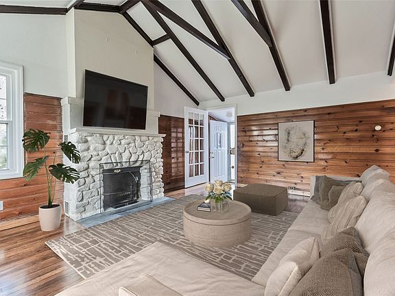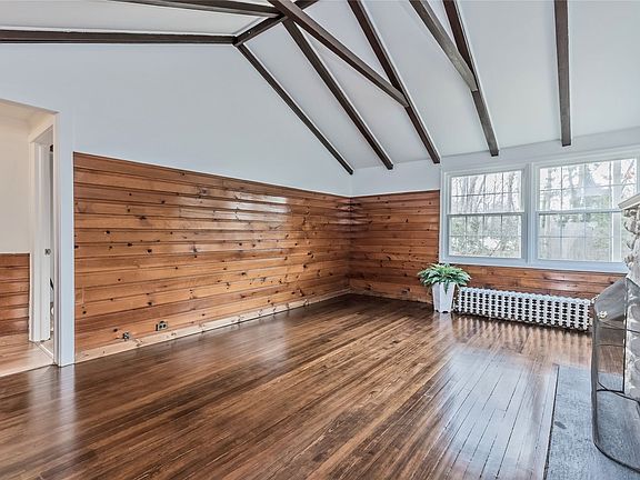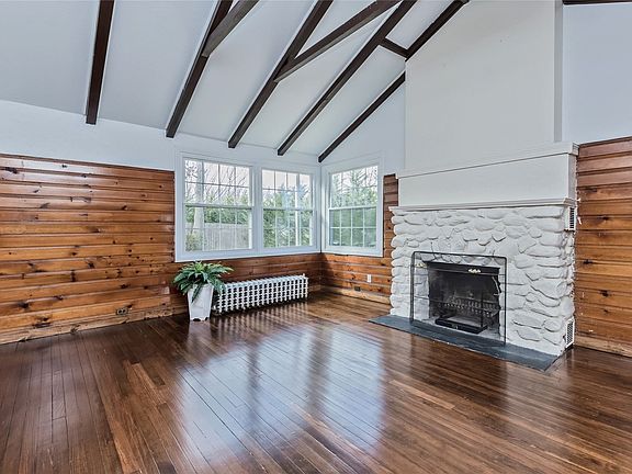 Enter this beautifully renovated home through the vestibule and step into the cozy and bright Great Room with vaulted ceiling, wood burning fireplace and newly refinished hardwood floors. Renovated bathroom and kitchen in 2022 restored to its beauty with a Urban Farmhouse flair. There is a separate dining room off the galley kitchen and stackable washer/dryer. Two Bedrooms and brand new full bathroom with shower stall. 10 year old windows. 12 year old roof. 100 Amp Electric. Oil heat with above ground 275 gallon oil tank in basement. Elevated stone terrace off front entrance. Full unfinished basement with access to 1 Car Attached Garage. Cesspool replaced in 1989.