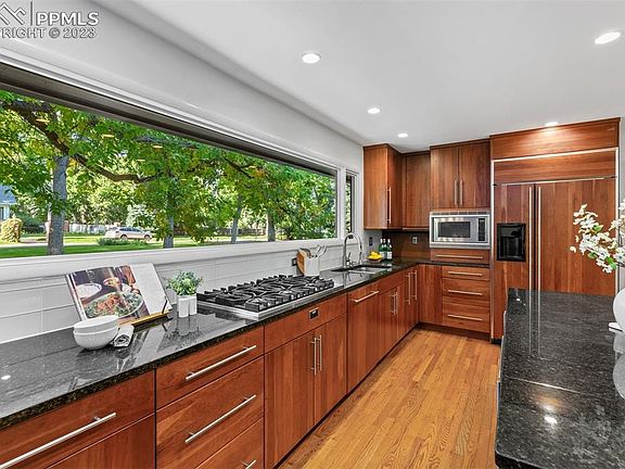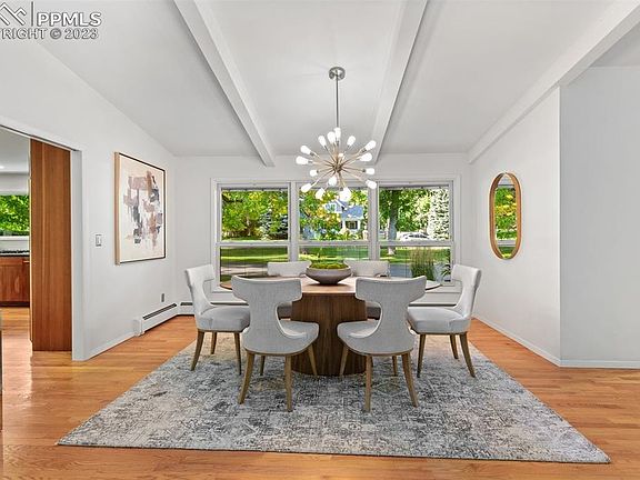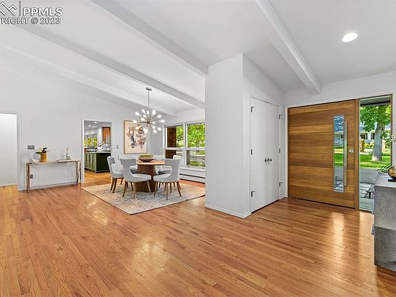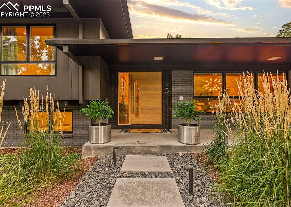 Set amidst the serene ambiance of a peaceful country lane, a stone’s throw from the renowned Broadmoor Hotel and Resort, this exquisite home is a harmonious blend of mid-century glamor and aesthetic finesse in the award-winning D-12 school district. The white oak pivot door leads into a spacious, sunken living room and dining area that conjures an era of classic elegance; its hardwood floors and towering limestone fireplace crafting a celebration space fit for both grand soirees and intimate homebound evenings. South-facing backyard doors open to a mature garden and a lavish entertainment expanse featuring an outdoor fireplace, a scene where indoor and outdoor realms merge, offering a mountain sanctuary within city bounds. Nestled in a cherished enclave, the home has been meticulously renovated and is move-in ready. Across nearly 4,700 square feet, its five bedrooms and five baths are centered by an updated kitchen, adorned with custom cabinets and stone counters, illuminated by a fourteen-foot window unveiling views of a leafy, tree-lined street. The main level harbors a tranquil guest suite with a full bathroom and generous walk-in closet. The primary suite features its own private deck, an intimate sitting area, and a beautifully reimagined bathroom with freestanding tub. Two additional bedrooms are connected by an elegant Jack-and-Jill bathroom, defining the upper level as a sanctuary of luxury. Descending to the lower level, a sandstone fireplace accents a spacious rec room, leading to an additional ensuite bedroom and a brightly lit dual-purpose laundry crafts room. Elegance is embedded in the home’s recent upgrades, characterized by Bridger steel and shou sugi ban siding, newly repaved driveway, modern garage doors, many new Pella windows, and a Class 4 roof. Every inch of this home is an ode to a life where elegance meets tranquility, a legacy of sophisticated living amidst the captivating embrace of one of the city's most storied and coveted neighborhoods.