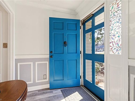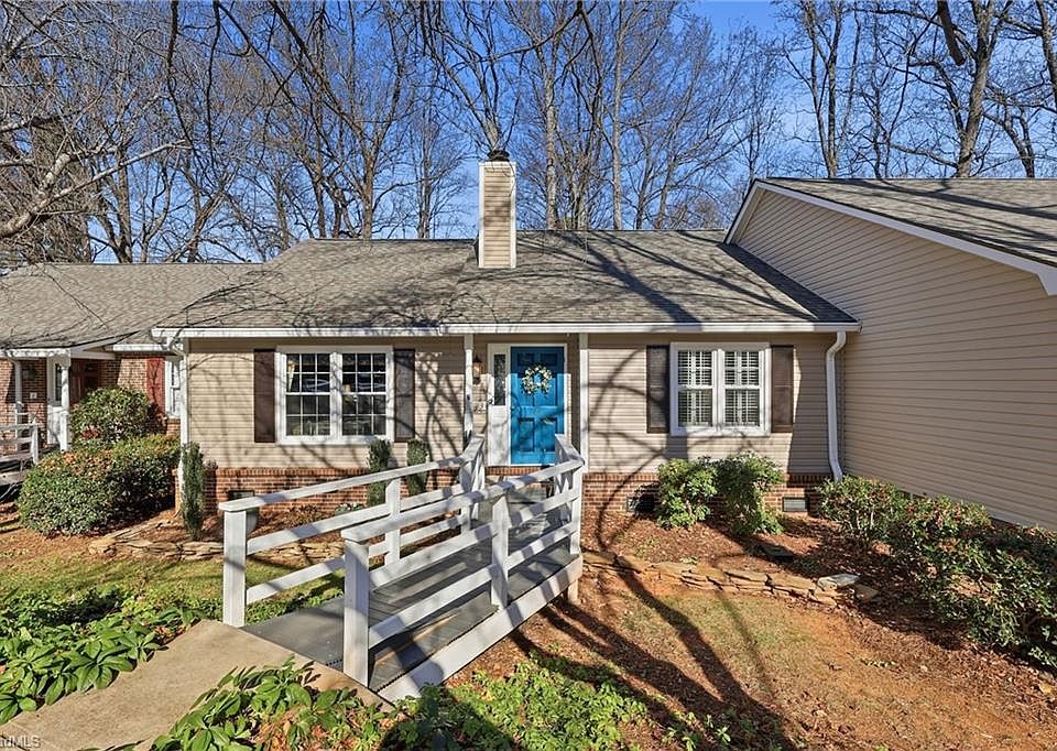 One level living at it's best! Spacious 2 bedroom 2 bath townhome located in the popular Guilford College area. Light and bright living room with fireplace/gas logs opens to large dining room with smooth ceilings and crown moldings. Updated kitchen with tons of cabinets, solid surface countertops, kitchen island, convection oven w/gas cooktop, and large pantry. Master suite with dressing area and large walk-in closet overlooks private wooded area. Second bedroom is currently being used as a den, and has large closet being used as a computer/work area. This home has good storage including partially floor attic and interior storage room with shelving. French doors lead to lovely, gated deck with porch swing and deck cover/lighting to remain. New roof in 2025. Assigned parking directly in front of home as well as additional visitor parking. Make an appointment to visit this quiet and pleasant home today!