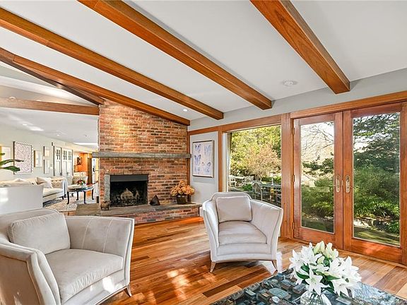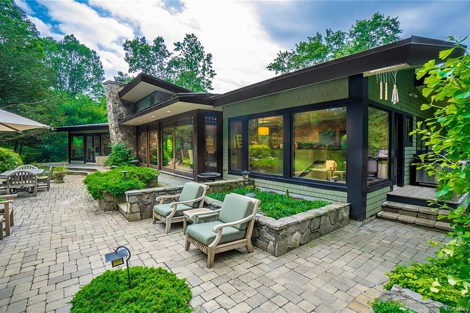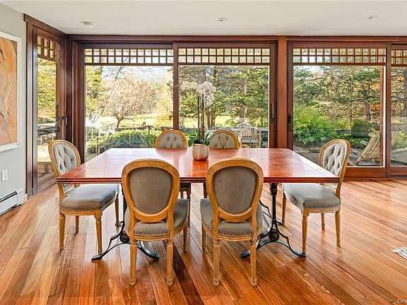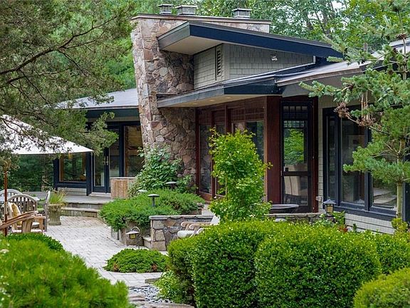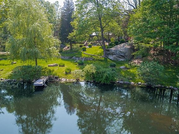 Tranquility at its finest, describes this Mid-Century Modern entertaining home with unobstructed pond views and babbling water gardens adjacent to the large outdoor flagstone terrace. Japanese inspired Zen gardens with manicured specimen plantings create more of a spa like environment with dramatic outdoor lighting. The rear of this Arts and Crafts Transitional home boasts floor to ceiling glass sliders opening up the entire living spaces to the private outdoor with rock outcroppings & strolling gardens. Pristine gardens yet with minimal required maintenance. Two parklike acres with your own your own pond and private dock, this one-of-a-kind setting is located on a cul-de-sac street with no through traffic. Single level living at its finest. The vaulted ceiling in the family room has a wood burning fireplace. An open flowing floor plan on the main level. So close to Stanford Train - NEW whole property on demand generator and boiler. Pool site as well.