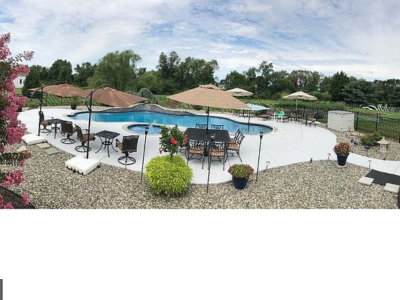 A rocking chair front porch sets the stage for this colonial farmhouse sitting far back off the street and nestled on 2 acres! Formal entry is bordered by a spacious formal dining room, office/study and leads to a dramatic 2 story great room. Open sight lines to the cook's kitchen, granite breakfast bar and sun filled breakfast room add to the easy flow of this home. A 1st floor master suite with 2 walk in closets, a luxurious bath with jacuzzi tub, double sinks and stall shower, also has access to a private rear deck. Upstairs you will find an open loft overlooking the great room, 3 additional bedrooms and full bath plus another laundry room if you choose. There is even the option of having a second master suite (the plumbing is there for another bath) or use as a fantastic game/bonus room. BUT WAIT, there's more!! Your own private oasis awaits. Fantastic patio with retractable awning overlooks a beautiful, heated pool and jacuzzi. The rear of the property has a large garden with an asparagus patch, apple, pear,and plum trees all in a zoned irrigation system. Full basement with standard door to rear patio is just waiting for your finishing touches. A breezeway connects the house to the two car oversized garage. This home has many special details throughout- too many to list.