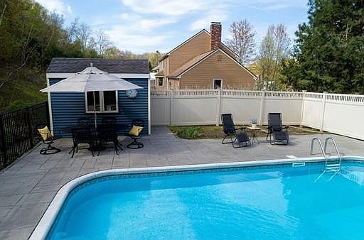 Lovely, one owner Colonial in desirable, cul-de-sac neighborhood! This cherished, family home has an elegant slate entry to welcome your guests. Family room with HW floors, crown molding and wood burning fireplace. Sun-filled, eat-in kitchen w/tile floor, updated stainless steel appliances, dbl sink & Corian counters. Spacious dining room w/crown molding & HW floors leads to a formal living room/play room & a huge, private entertaining deck! Large, 2nd floor Master has a walk-in closet, updated 3/4 bath, attached home office/den/nursery with fireplace & closet along with 2 more good sized bedrooms w/bamboo floors & full tiled bath. Relax by the private, in-ground pool oasis w/maintenance free, stamped concrete patio 2010, pool liner 2015, pool pump 2018, aluminum fence 2012, pool shed and vinyl privacy fence. Spacious 2 car garage, CENTRAL AIR, convenient back entry hall w/washer,dryer,closet and 1/2 bath, complete this wonderful home. Great commuter location, only 3 min to Rt 290!
