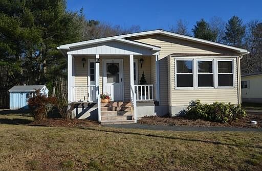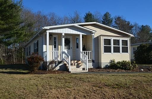 Fabulous over 55+ Community at Leisurewoods. One level living at its finest in this oversized "Castle" style home with front porch and side deck. All new carpet throughout and freshly painted. Featuring formal dining room, cathedral ceiling, skylights, huge open kitchen, Master suite with walk-in closets, 2 full baths & more! Private backyard with storage shed backs to woods for added peace and privacy. HOA Fee includes land rental, trash p/u, plowing, use of clubhouse & pool, limited transportation.