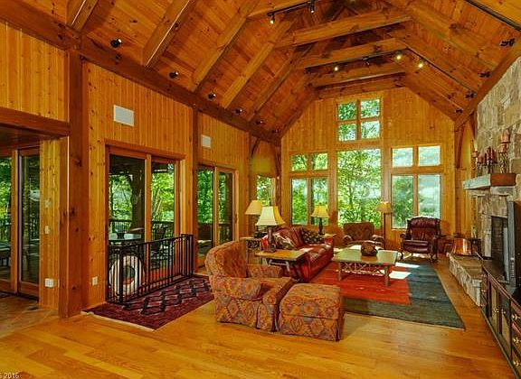 Gated estate with privacy and convenient location.Nearly 6 acres,views,a short golf cart ride to the club and marina.Or take the path from your door to a private dock on 65-ac Lake Cardinal.Designed by Platt, this 5,000 sq ft post&beam lodge has an open great room, native stone fireplace and a chef's kitchen.Huge master suite with an office with fireplace and private porch.Plus a guest room and 3 BRs up. Down is a rec room and tons of storage. Minutes away...NC's largest private lake.