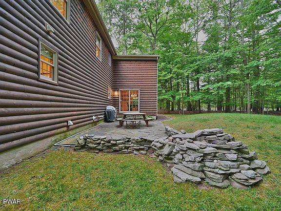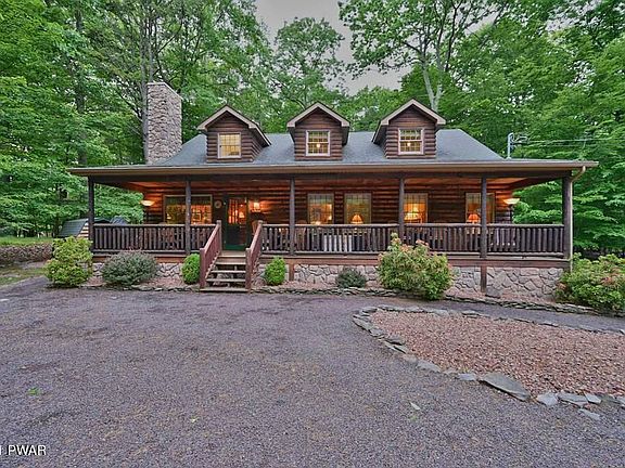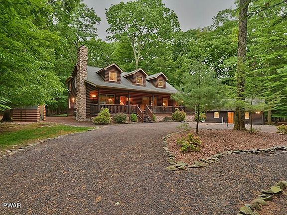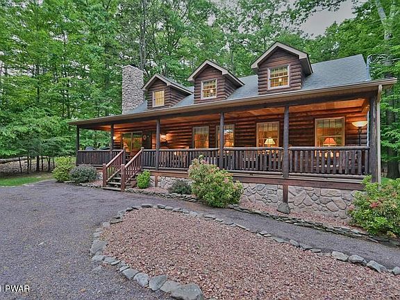 MAGNIFICENT LOG HOME IN WOODLAND HILLS AT LAKE WALLENPAUPACK! This private 4 bedroom, 2 bath masterpiece comes fully furnished & features vaulted ceiling, open floor plan, spacious living room with stone faced fireplace, huge kitchen with breakfast area & formal dining room! Central AC & high efficiency baseboard heating! First floor offers 2 nice bedrooms and full bath. Upstairs boasts a massive Master bedroom suite with full bath and walk in closet! 4th bedroom & family room/loft area complete this gorgeous home! Sit on the covered ''rocking chair'' front porch or enjoy the backyard patio! 1 car detached garage & utility shed to store all of your lake toys! Located at the end of a cul-de-sac, in a private setting, close to the Grassy Beach for lake access, boat slip & BBQ Season!
