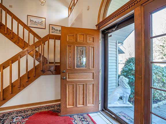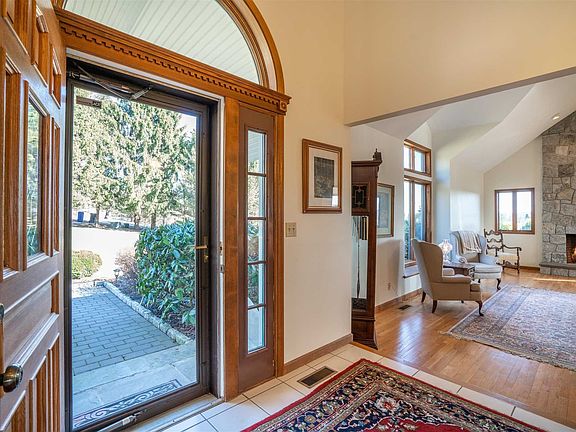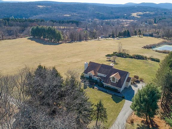 Stylish Colonial with sun-filled open interiors on 5 pastoral acres with scenic vistas overlooking fields and distant hills. Front entry is open to second floor, the first floor flows smoothly from room to room with large windows and multiple sliders giving each room generous natural light. The family room features a wet bar, fireplace, dining room and sunken living room with stone fireplace all with hardwood floors. Eat in kitchen with breakfast bar has a slider to the wrap around deck perfect for entertaining, half bath and laundry/mud room compete the main level. Second floor Master bedroom features a private balcony, seating area, hardwood floors, 2 walk in closets, and master bath with double vanity sinks. Three additional bedrooms and a hall full bath finish the second floor. Full basement includes family room with wet bar, wood burning stove and slider to back yard and, full bath, office with slider to back yard and utility storage room. Resurfaced Tennis & Pickle ball court, plus a HOA shared pond. Located just 5 miles from Metro North train station, less than 90-minutes to Manhattan.