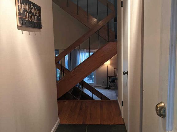 Welcome Home! Move in ready and easily maintained home offers 3 generous sized bedrooms, en-suite master bath and walk in closet, updated kitchen and baths, newer roof, furnace, a/c, electric panel and hot water heater. Toasty gas heat, gas hot water heater and wood burning fireplace. Hardwood floors throughout with carpet in bedrooms. Living room has lots of natural light and door to patio (overlooking stream, pond and golf course 9th hole). Bonus family room lower level, with new laminate flooring includes laundry and crawl space storage. Kitchen boasts of newer cabinets and travertine backsplash. and door to private courtyard. Kitchen refrigerator stays as well as washer and dryer. Updated second floor bath with new vanity, toilet and wainscote walls. Inviting home ready for you!