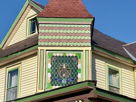 This 3,349-square-foot Victorian captures attention with its striking rooflines, charming round tower, intricate woodwork, and distinctive original stained glass windows. The inviting front porch, with its elegant spindles, finials, and newel posts, sets the stage for the character found within.