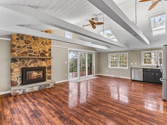 Jenkins Pond Waterfront Retreat! This charming 3 bedroom, 1 bath Ranch is perfect as a summer getaway or a year round residence! Step into the open concept family room and kitchen featuring vaulted ceilings with double skylights, a beautiful gas burning fireplace and stainless steel appliances. A sliding door leads to the deck offering breathtaking water views! The updated bathroom boasts a gorgeous tiled shower! Three comfortable bedrooms with newer flooring & paint completes the main level. The partially finished lower level includes a cozy family room with gas fireplace and walk out to beautifully landscaped yard! A short, scenic path leads to 30' of waterfront where you can lounge, swim, fish, kayak or simply float in the serene waters of 87 acre Jenkins Pond! Title V in hand, Town water, shed & outdoor shower! Nestled in an excellent location, this property is a true waterfront GEM!