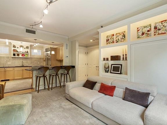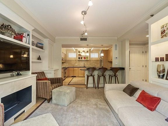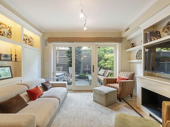 Nestled on a quiet tree-lined street of single-family townhouses this home offers 2,240 SF of living across four thoughtfully laid out floors. Upon entry, you'll find an elegant formal living & dining room with a gas fireplace, crown molding, wainscotting, a built-in entertainment unit & custom window treatments. The lower level serves as the primary living area w/ a spacious kitchen & family room that seamlessly opens to a landscaped patio with irrigation system. Features include shaker cabinetry, granite countertops, wine fridge, peninsula w/ seating, custom built-in shelving & storage, & a powder room. Upstairs you'll find the second & third bedrooms with custom closets, built-in storage, as well as built in work spaces for home offices, & a full bathroom. The upper level offers a private master suite w/ cathedral ceilings, sky-lights, & a built-in window seat. Additional features include hardwood floors, high ceilings, custom blinds & shutters, & one garage parking space.