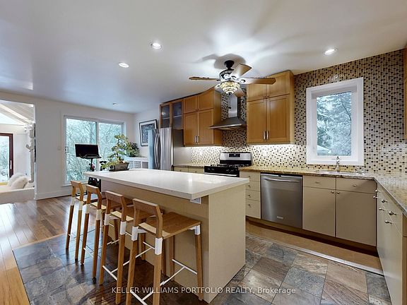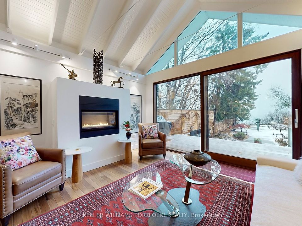 Paradise on the Bluffs with Lake Views. A rare, private and artfully designed retreat-once home to a renowned actor during multiple filming seasons. Set high on the Scarborough Bluffs overlooking Lake Ontario, this exceptional property offers serene living immersed in nature, just 12 km from downtown Toronto. Tucked away on a quiet cul-de-sac, this detached luxury residence features 2 bedrooms, 2+1 bathrooms, 3 parking spaces and an EV charger. The beautifully landscaped backyard unfolds to tranquil lake views framed by mature trees, with birds and deer as frequent visitors. The open-concept main floor is designed for comfort and awe: a sunken living room with cathedral ceilings and sliding glass doors to the yard and lake; a granite-clad kitchen with island seating for four; a dining area with custom cabinetry overlooking the living space and shimmering water; and a well-appointed bedroom with a large closet. The second floor offers refined, Asian-inspired decor, highlighted by an oversized primary suite with a spa-like 5-piece ensuite, a cozy family room and a dedicated office. The lower level is equally impressive, featuring a granite kitchen ideal for entertaining, a fully equipped gym and sliding doors leading to the backyard and lake views. Outdoors, the spectacular 400-foot-deep yard is adorned with Brazilian pebbles, flowers and trees, anchored by a fragrant lavender bush. Two expansive decks are perfectly positioned to take in the lake and lush surroundings. Curated with original artwork and sculptures from the artist-owners' travels, every space is infused with creativity and soul. Steps to a park, a 10-minute walk to the Rosetta McClain Gardens, a short drive to the beach, and minutes to the Bluffs-this is a rare opportunity to experience a true lakeside sanctuary in the city.