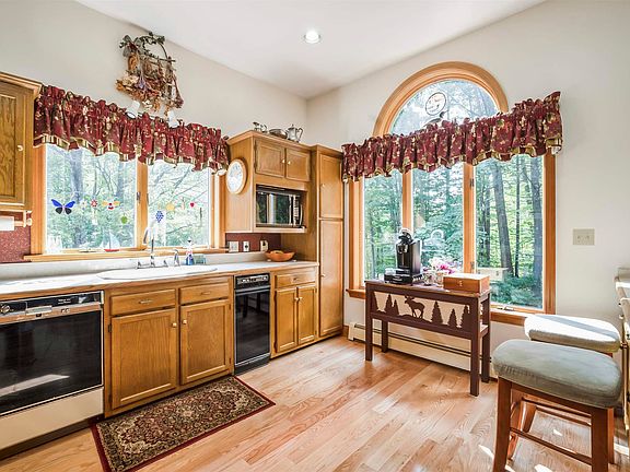 Beautiful contemporary home with large palladian windows to let in the natural light. The home features a front to back eat in kitchen a spacious living room with woodstove and direct access via sliders to the deck with retractable covered awning that is perfect for entertaining. The first floor also has 2 additional rooms one has a large window seat with storage as well as a large closet, this is currently being used as den. The second room is being used as a guest room. Upstairs boasts 2 large bedrooms the house also has 2.5 baths. There is a finished basement that previously had a woodstove, the ductwork remains if you would like to install another. There is a 2 car garage below with a detached large 2 car garage that has electric as well seasonal water and a large bonus space above. The detached garage was used to work on automobiles and has a compressor as well. The home has many amenities including; central vac, central air, retractable awning, a potting shed built under the porch. An entrance to the Sewall Woods Trail is located at the end of the cul-de-sac perfect for walking, jogging or cross country skiing. Easy walk to Carry Beach on Lake Winnipesaukee as well as short walk to town. Come enjoy all that Wolfeboro Amerca's Oldest Summer Resort has to offer. Due to community septic covenants limit each household to 2 bedrooms. Town also has listed as a 2 bedroom. Showings to begin at Open House Saturday July 31st and Sunday August 1st from 12 - 2.