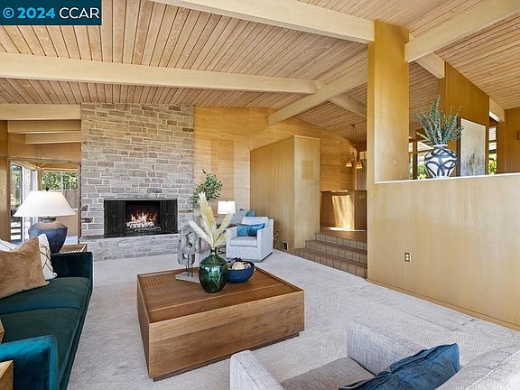 Very light and bright Mid Century Modern with views. Court location-very private, serene and quiet. Many original features plus some newer components. Fabulous natural wood vaulted ceilings, large living room and family room. Single level living with 3 bedrooms plus den and 2 1/2 baths, including primary bedroom on street level and 1 bedroom with bath down. Large deck with patios and views. Beautiful mature landscape. This is a very special home and great location! Open Sunday 6/16/24 from 1-4.